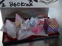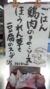 「メニュー表には書いてないけど、フルーツきんとんも入れてのカロリーだよ~」と給食の先生。目を下に移すと折り紙でおった小物の飾りが…。これ先生が折ったの?と聞くと、「いや~早く来た生徒たちがきれいに折ってくれるのよ」とニコニコ顔。