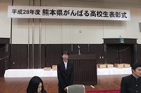 去る11月18日(金)に、熊本テルサにて、熊本県の「平成28年度がんばる高校生」の表彰式が行われました。本校からは、4年次生のFさんが受賞し、蒲島知事から表彰を受けました。