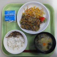 今日のメニューは、ワカメご飯、牛乳、太平燕(タイピーエン)、いきなり団子。