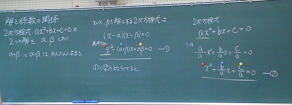 | | 2次方程式の解と係数の関係 難しそうだなと思いながら参加しましたが、やっぱり難しかったですね。 先生が赤・紫・黄のマグネットを出し板書にポイントして、「ここと、ここは同じ」とやったのには驚きました。 マグネットには物を貼り付ける以外の使い方があるんだぁと思った記者でした。 |