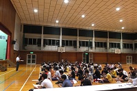 夏休み前の全校集会では、那須副校長より今年度4月から今までの行事のことなどを含めて挨拶をいただき、校歌斉唱で会を閉じ、その後、教務部・生徒指導部・進路指導部・保健部より連絡がありすべてを終了しました。