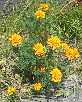 花壇の奥には、水仙の球根が植わっています。傷つけないよう注意しながら草を取り、畝を掘り、石灰と牛糞堆肥、鶏糞を混ぜて土を作り、ポーチュラカ、日々草、マリーゴールドの花の苗を植えました。