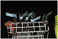 | | ←実験道具 6種類の元素を含む溶液をそれぞれ炎の中にかざし、どの元素が含まれているか生徒が考えました。 |