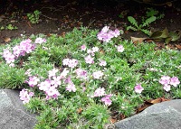正門前の花壇には、芝桜がちらほらと花をつけ始めました。