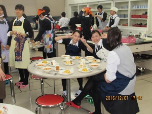 今日は第4回の放課後キッチンが行われました。今回のメニューはクリスマス前ということで、ピザ、ミネストローネ、ケーキを作りました。生徒45名、育友会の保護者の方が参加して行われました。美味しそうな料理が出来上がっていました。