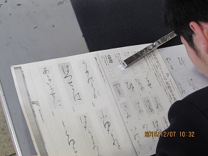 書道の授業風景です。仮名の練習をしています。慣れない小筆で一生懸命書いていました。