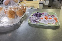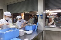 4月10日から、1年生も給食が開始されました。本校の給食は完全給食で、食堂の隣の厨房で職員3名で心を込めて作っていただきます。