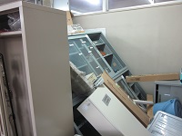 学校の施設では、漏水や、壁面のひび割れ、職員室や各準備室では書類棚等が倒れたり、物品が壊れたりするなど今まで目にしたことのない光景がありました。