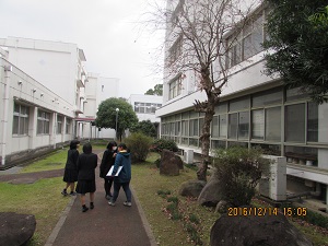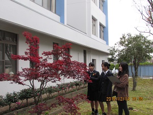 今日は樹木の写真とその樹木の特徴などが書かれた用紙を班ごとに渡され、その樹木を構内から探すという活動をしていました。生徒たちは寒い中、学校内を散策しながら樹木を探していました。