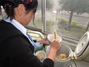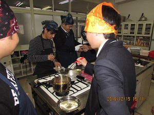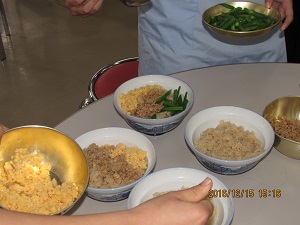 家庭科室にいくと、調理実習が行われていました。メニューは三食どんぶりとすまし汁です。慣れない手つきで調理していました。楽しく頑張っていました。