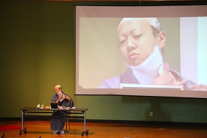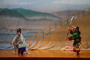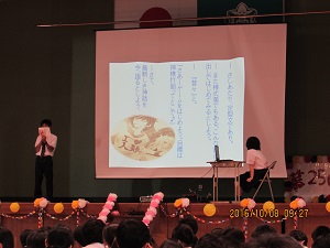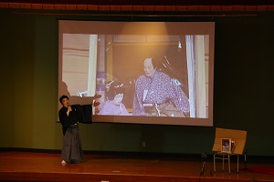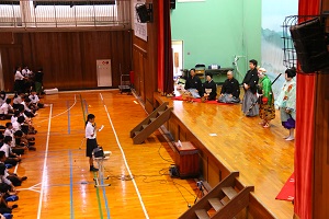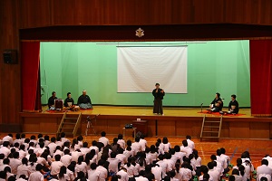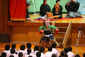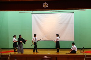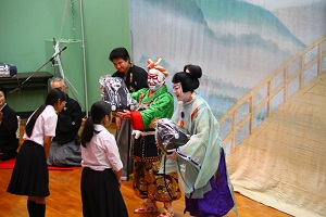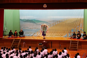 本日、芸術鑑賞が行われました。今年は古典芸能のジャンルから「歌舞伎」となりました。歌舞伎の歴史、化粧の仕方、楽器の説明、古典の説明などが分かりやすく説明して頂きました。アトラクションでは生徒が歌舞伎に挑戦する場面があり、会場から笑いが起こりました。最後に演目「舞踊 五条橋」があり、生徒たちも初めての歌舞伎に見入っていました。