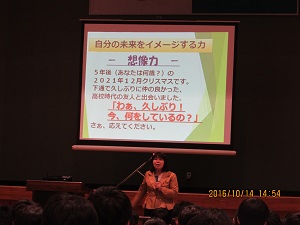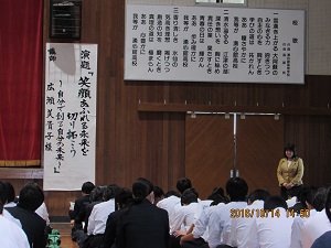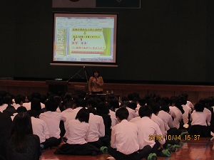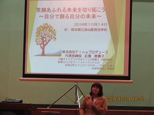本日7限目に進路講演会が行われました。株式会社Fineプロデュース代表取締役の広瀬美貴子さんに来ていただき、テーマは「笑顔あふれる未来を切り拓こう~自分で創る自分の未来~」で講演してもらいました。「夢に数字(金額・数量・数値など)を入れると”目標”になる。目標に日付・時間を入れると”予定”になる。予定になると高い確率で実現する。」という”夢を実現するための行動計画”を紹介していただきました。生徒たちもしっかりと耳を傾けていました。