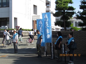 今朝は育友会の方々が、正門前で「あいさつ運動」を行いました。