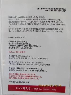 廊下に掲示されているものを紹介します。保健部で作成されたもので、HIVの予防に関する啓発です。写真がとてもきれいに撮影されており、目をひくものとなっています。