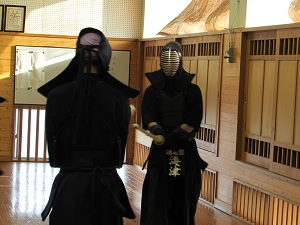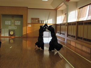 体育館に向かって歩いていると、剣道部の気合の入った声が聞こえてきたので見学させてもらいました。前原先生のご指導の下、技の稽古が行われていました。