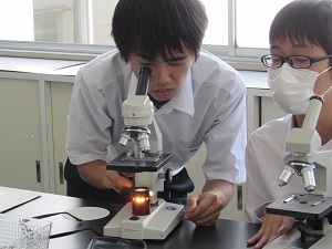 昨日に引き続き、生物基礎の授業風景を紹介します。今日は生徒が顕微鏡を使ってオオカナダモの葉の細胞を観察をしました。
