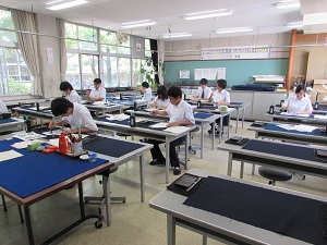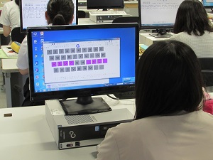 情報処理では、タイピングと2進数、16進数の仕組みについての授業が行われていました。生徒たちはブラインドタッチができるように黙々と取り組んでいました。