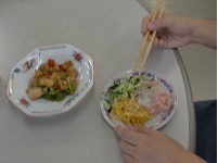 フードデザインで調理実習を行いました。酢豚と拌三糸をつくりました。