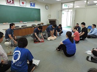 まず、消防士の方々により「もし、人が倒れていたら・・」で、模擬的にやっていただきました。その真剣さと機敏さに鳥肌がたち、「命」を守ることの厳しさが伝わってきました。その後、4班に分かれて実際に心肺蘇生法、AEDの使い方など学びました。