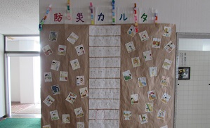 保健室前に防災啓発のために、「防災カルタ」や役立つ道具の紹介してあります。熊本地震の教訓を生かしていきたいと思います。