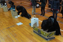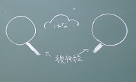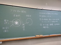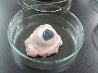 目玉を瞳孔を上に向け水平に半分に切ると、内側の周りが黒くなっています。「どうして黒いのですか?」の生徒の質問には、「瞳孔から入った光が反射しないように黒いのです。」との先生の答え。納得して、実際にペアで解剖をしました。
