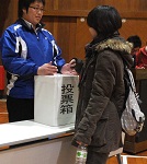 1名ずつ進み、選挙管理委員のところでチェックを受け投票用紙をもらいます。もらったら、ステージ上の区切られた記入場所で記入し、投票箱に入れて会場を出ます。
