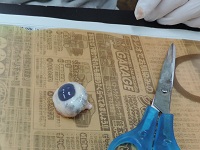 ガラス体・網膜・最後には、透明できれいな水晶体を取り出し、新聞の文字に乗せてみます。新聞の文字が大きく見えました!