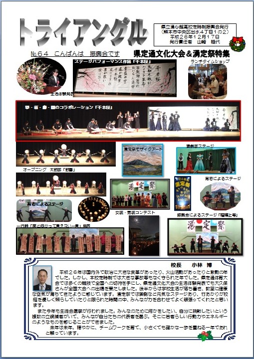 12月17日(水)に振興会役員の方々のご尽力で、トライアングル№64が発行されました。今回は、県定通文化大会&湧定祭特集で、それぞれでの生徒の活躍の様子が掲載されています。