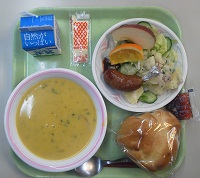 というわけで、今日のメニューは、ドイツパン、牛乳、ワンハンドソーセージ、ジャーマンポテト、パンプキンスープです。さすがに、ビールは無理ですね。
