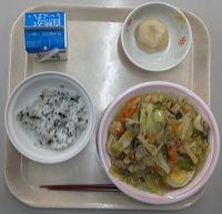 今日のメニューは、ワカメご飯、牛乳、太平燕(タイピーエン)、いきなり団子。
