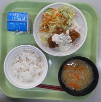 で、今日の献立は、ご飯、牛乳、チキン南蛮、切干大根の味噌汁。