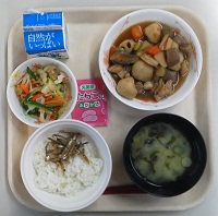 ということで、今日の献立は、ご飯、牛乳、がめ煮、白菜サラダ、明太ふりかけ、味噌汁です。