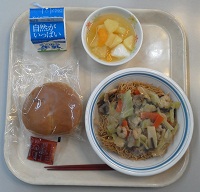 米粉パン、牛乳、皿うどん、杏仁豆腐