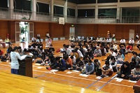 集会では、学校長より「・・・今日は、昨日の自分を超えよう!明日は、今日の自分を超えましょう!夏こそ劇的な変化ができます。続ければ変化は起こります。何かを続けてください・・・・」とのお話をいただき、その後、教務部・生徒指導部・進路指導部・保健部から夏休みの過ごし方についての諸注意がありました。