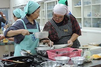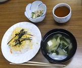「ちらし寿司」・「豆腐としめじの味噌汁」・「きゅうりと鶏肉の和え物」の3品をつくりました。元気のいい生徒も、もの静かな生徒も、人生の先輩にやさしく指導していただき、笑顔の調理実習でした。一緒につくる姿は、祖父母と孫の微笑ましい姿でした。