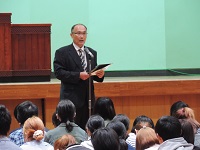 副校長の挨拶の後に、在校生代表の生徒会長が歓迎の言葉を述べ、新入生代表が「学校のことをたくさん教えてください」と挨拶を行い、和やかな雰囲気で式が進みました。
