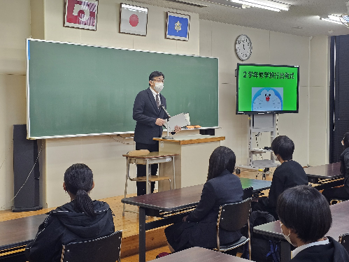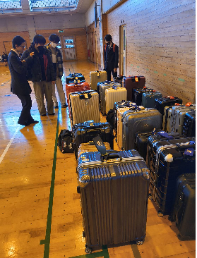 12月12日(金)早朝より修学旅行の荷物を旅行先へ発送しました。順調に手続きも終わり、いよいよ15日(月)~18日(木)まで関東方面へ2学年生徒が出発します。また、4時間目には修学旅行出発式を行いました。団長の木田教頭先生のお話から修学旅行で学ぶべき事、体験すること、学年でこの行事に参加できる事についてもお話し頂きました。生徒代表挨拶では2組那須さんが修学旅行で楽しみにしている事や家族や先生方のお陰で参加できる感謝の気持ちを全体の前で話して頂きました。無事に出発できる事と思います。